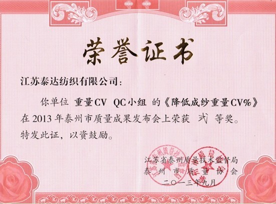 同時(shí),公司QC小組攜此課題參加了2013年“泰州移動(dòng)杯”QC小組質(zhì)量成果大賽并最終入選。2013年9月26日,泰州市質(zhì)量技術(shù)監(jiān)督局特邀有關(guān)領(lǐng)導(dǎo)和專家擔(dān)任評(píng)委,對(duì)各企業(yè)入選成果進(jìn)行評(píng)審。最終,我公司“降低成紗重量CV%”QC小組榮獲二等獎(jiǎng),這是姜堰區(qū)入選企業(yè)榮獲的最高名次,亦是泰州全市、區(qū)范圍內(nèi)紡織企業(yè)獲獎(jiǎng)的最高名次。